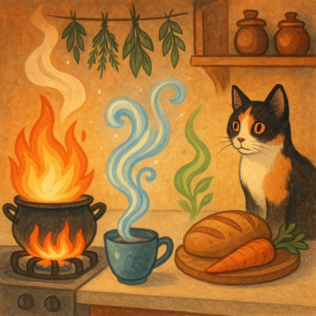 Силы стихии на кухне: как зарядить еду или напитки Магия — не обязательно свечи и мантры. Иногда достаточно чашки чая и осознанности. Кухня — это храм, а кастрюля — котёл ведьмы. И если знать, как направить энергию стихий, можно буквально насытить пищу смыслом, силой и защитой. Любое термическое приготовление — уже ритуал. Когда вы готовите на плите или запекаете — вы работаете с Огнём.