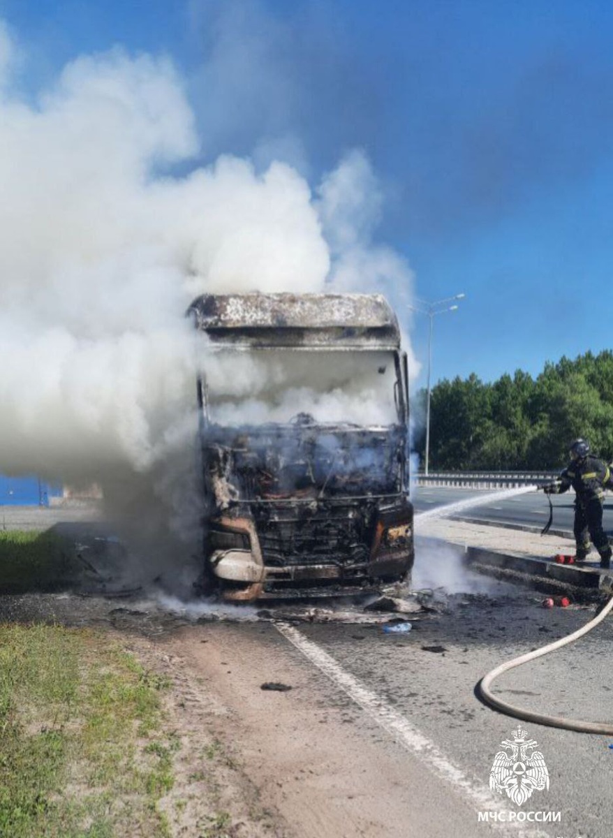 ⚡️Сегодня утром при подъезде к Президентскому мосту сгорел КамАЗ 🚒 Пожарные потушили кабину тягача. Ее полностью уничтожил огонь, также пострадал прицеп. Обошлось без пострадавших. Причина загорания устанавливается специалистами МЧС.