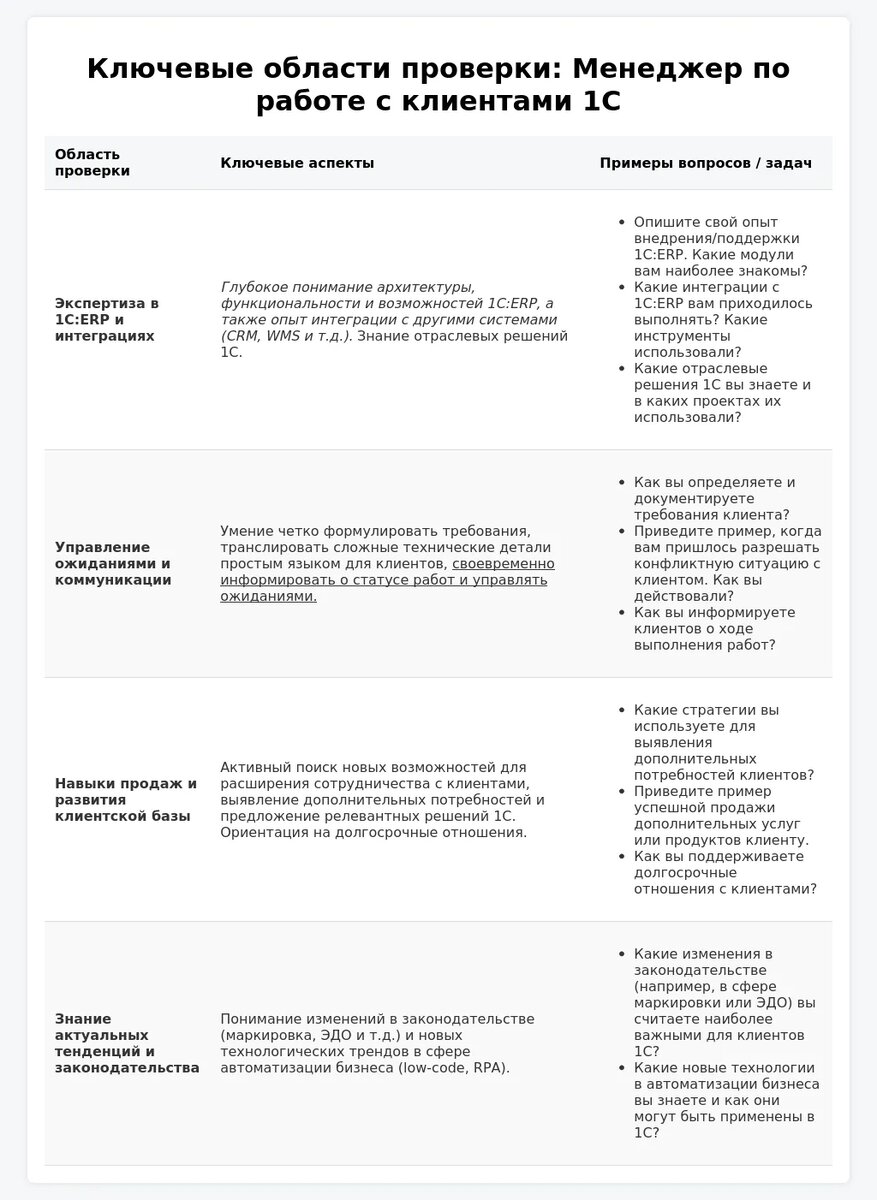 Выделите ключевые навыки и личные качества, необходимые для успешной работы с клиентами в сфере 1С. Обязательно подкрепите каждый пункт конкретными примерами из своего опыта, демонстрирующими, как вы применяете эти качества на практике. Важно показать понимание специфики работы с 1С и потребностей клиентов в этой области.