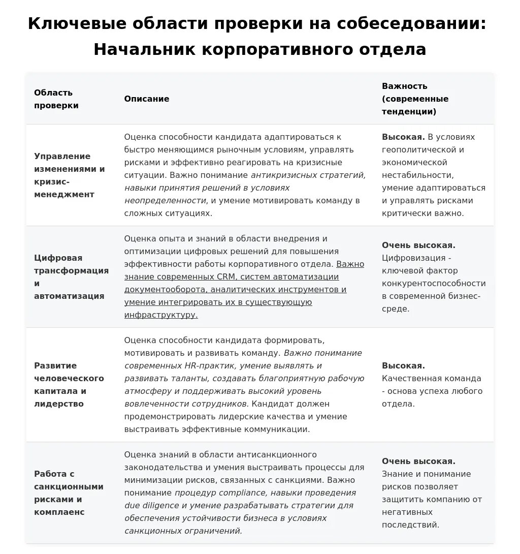 Работодатели оценивают кандидатов на позицию начальника корпоративного отдела по нескольким ключевым областям: