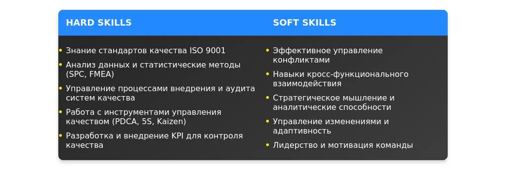 Ведущий специалист по качеству должен обладать следующими hard skills: