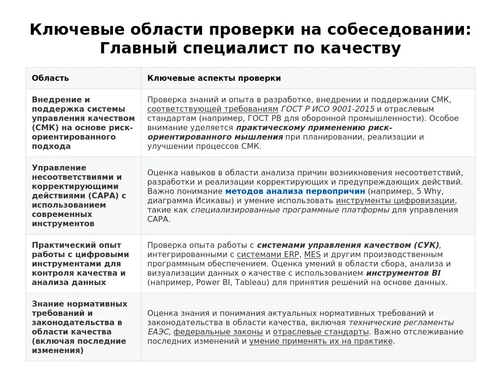 Работодатели при оценке кандидатов на должность главного специалиста по качеству уделяют внимание нескольким ключевым областям:
