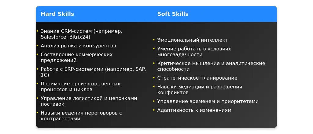 После адаптации: "Ведение переговоров, работа с крупными клиентами, знание CRM-систем."