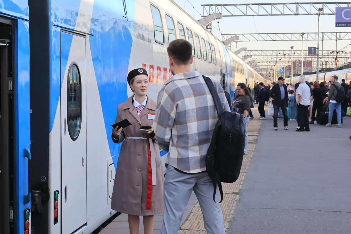 Двухэтажный сидячий поезд с названием "Аврора". 5 часов 30 минут в пути. Поезд с таким названием и с такой расцветкой ходил ещё в 1963 года, но в 2009 году с запуском "Сапсанов" был отменён. Путь от Москвы до Ленинграда "Аврора" была 6 часов - это сильно меньше, чем стандартные поезда, даже чем "Красная Стрела". Само собой это было шиком в те годы, однако с 80-х годов "Аврору" потеснил более быстрый ЭР-200. В конце 2024 года РЖД запустили новый двухэтажный сидячий состав под старым брендом. Покрасили его в похожие цвета. В общем, вышла такая интересная реставрация. Из Москвы поезд отправляется очень рано: в 6 часов. Если вы далеко живёте от вокзала, вам будет сложно без такси добраться. Но мне как раз несложно - пара станций на электричке, которые начинают раньше метро ходить. Вот так примерно выглядит салон второго этажа. В принципе, я уже ездил ранее на таком поезде (сообщением "Москва - Воронеж"), так что не то чтобы для ме