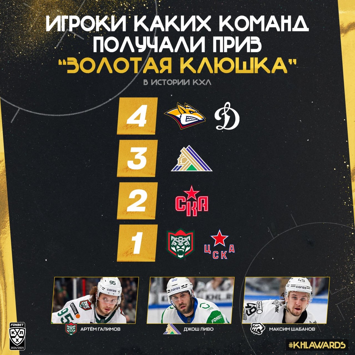 Сегодня вечером «Салават Юлаев» может получить свою четвертую «Золотую клюшку» и сравняться по этому показателю с «Металлургом» и «Динамо». #KHLAwards