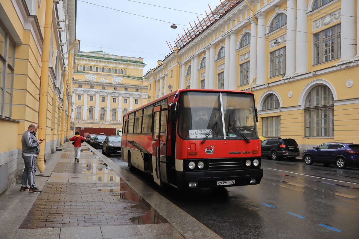 После обкатывания возобновлённой "Авроры" на обратном пути пробовал новый способ перемещения между двумя столицами, коим никогда ранее не пользовался: автобус! Но автобус не абы какой (стал бы я обычным рейсовым автобусом на этом направлении просто так ехать), Речь об "Икарусе-256", который уже, можно считать, перешёл в категорию "ретро". Компания Мосретротранс привезла свою технику на парад транспорта в Питере. И для всех желающих открыла возможность на этом же самом ретротранспорте проехать! Цены более чем гуманные: 2000 в одну сторону (а если брать 2 места, то 3500). Согласитесь, что за столько вы и на самом дешёвом поезде в наши дни уже не уедете. Поэтому, когда увидел предложение, то взял не думая! Отправление происходило с улицы Росси (нечасто отсюда, думаю, в Москву уезжают), что уже само по себе необычно. Не с вокзала или автовокзала, а прямо из центра города, безо всяких неприятных процедур. По дороге заехали попозировать к Казанскому собору с другим "Икарусом", местным. Мн