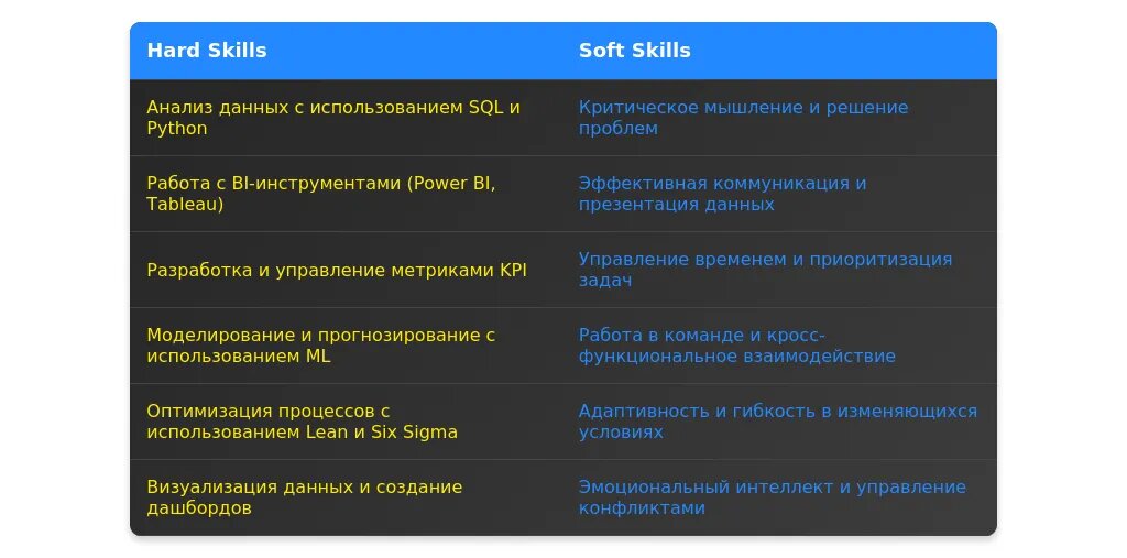 Навыки следует перегруппировать, чтобы выделить наиболее релевантные для вакансии. Убедитесь, что ключевые компетенции, такие как знание SQL, Tableau или Power BI, указаны в начале списка. Используйте ключевые слова из вакансии, чтобы резюме прошло автоматический отбор.