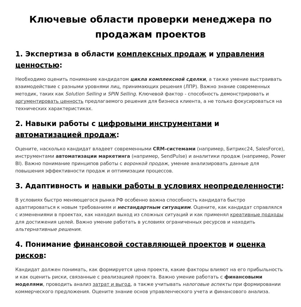 - Опыт в продажах сложных проектов: Проверяется знание специфики проектных продаж, умение работать с длинным циклом сделки, понимание потребностей клиента и способность выстраивать долгосрочные отношения.