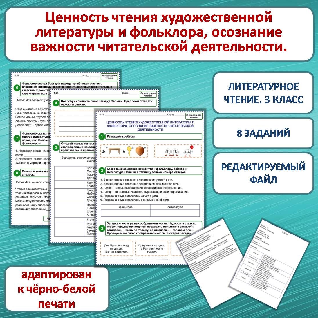 Рабочий лист «Ценность чтения художественной литературы и фольклора, осознание важности читательской деятельности» разработан к уроку литературного чтения в 3 классе. Состоит из 8 заданий (на трех листах). Имеются ответы к заданиям (на двух листах). Задание 1. Разгадайте ребусы. Задание 2. Какое высказывание относится к фольклору, а какое к литературе? Впиши в таблицу только номера ответов. Задание 3. Загадка – это игра на сообразительность. Недаром в сказках герою нередко приходится проходить испытание загадкой: отгадаешь – быть по-твоему, не отгадаешь – голова с плеч. Проверь и ты свою сообразительность. Разгадай загадки. Задание 4. Попробуй сочинить свою загадку. Запиши. Предложи отгадать одноклассникам. Задание 5. Отгадай малые жанры фольклора. Заполни таблицу: в левый столбец впиши название жанра фольклора, пример которого представлен в правом столбце таблицы. Задание 6. Фольклор всегда был для народа «учебником жизни», благодаря которому в детях воспитывались положительные каче