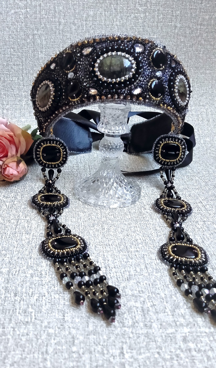Вот и завершилась работа над очередным большим кокошником)) . Стараюсь их делать не похожими друг на друга, благо материалы позволяют. В этом и есть изюм современных кокошников, нет определëнных рамок, стандартов, только полëт мыслей и безграничная фантазия). Рясны можно отстегнуть.