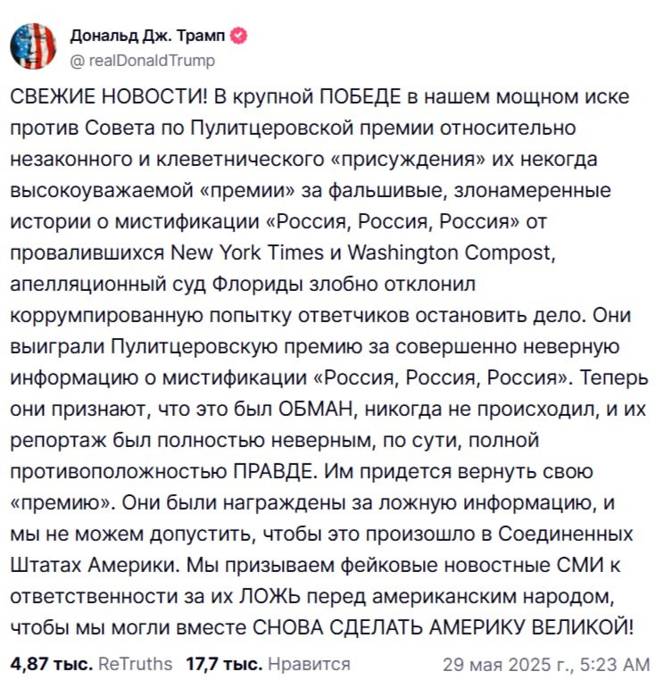 Это для понимания того, как все еще "задевает" Трампа фейковая история 2016-2019 года о связи его избирательного штаба с Россией. У газеты New York Times забирают журналистскую премию. Трамп весьма злопамятный, просто так, тогдашнее предательство Зеленского, он не простит.