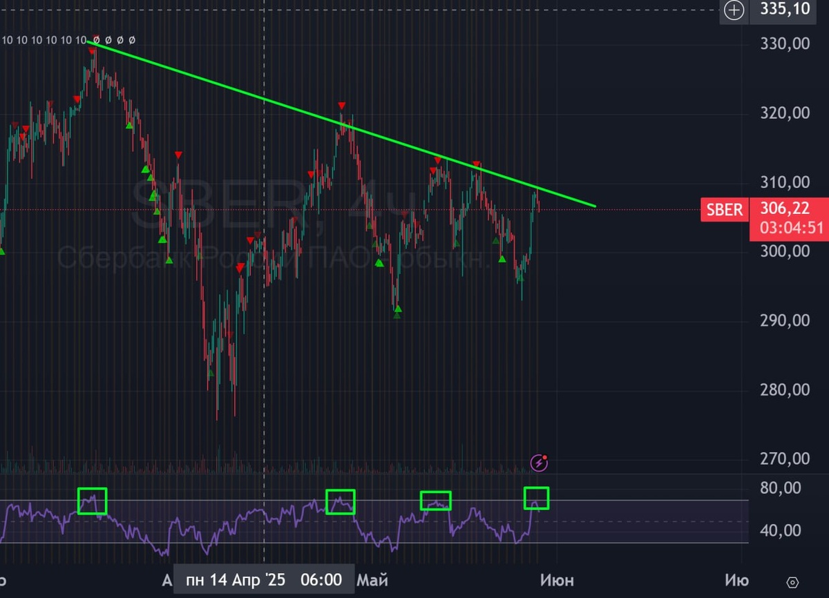 🏦 #Сбербанк $SBER #bogdanoffinvest 🟢 Красивого треугольника тут нет, но есть вот такая наклонная линия, от которой постоянно отбиваемся. При этом на 4-х часах в этих зонах всегда есть перекупленность. Сегодня точно такая же ситуация. 🚗 Если шортить Сбер, то стоп надо ставить над этой наклонной линией.