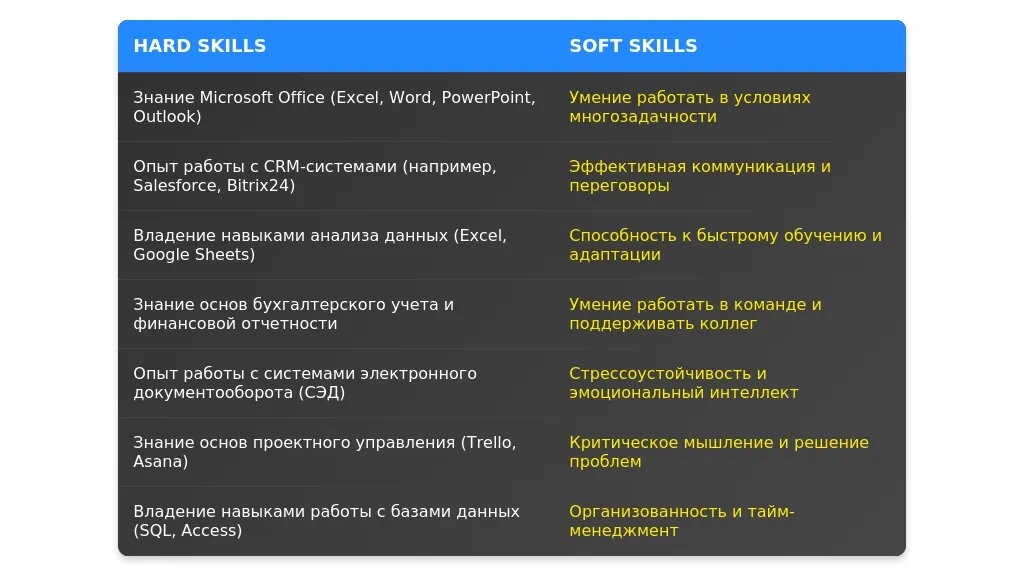 После адаптации: "Владение MS Office (Excel, Word, PowerPoint), опыт работы с CRM, навыки документооборота."