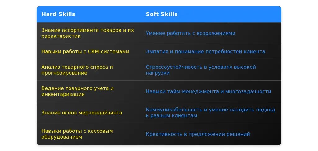 После адаптации: "Глубокое знание продуктовой линейки, умение выявлять потребности клиентов."