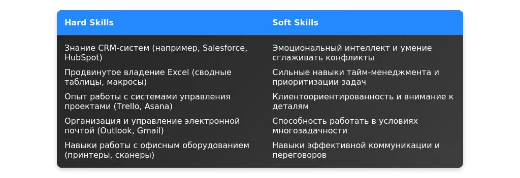 - Организованность: "Успешно управлял расписанием руководителя, организовывал встречи и мероприятия."