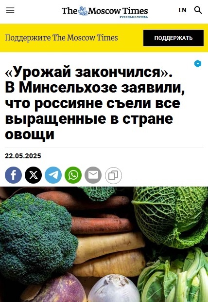 Весь декабрь, январь и февраль овощи росли, росли, а наступил май - всё сожрано дочиста! И таки да - попугаев с ежами мы с вами тоже съели. Moscow Times, в котором пропечатано о сожранных дочиста в России овощах, всё время забывает это добавить, зла не хватает каждый раз напоминать... И из-за этого вот всего я вчера в Магните подралась с какой-то бабкой за последний во всей стране полусгнивший помидор. Этой карге всё равно уже прогулы на кладбище ставят, а мне здоровое питание нужно. Грустно, короче.. - эта статья опубликована на сайте паблико.ру вот здесь