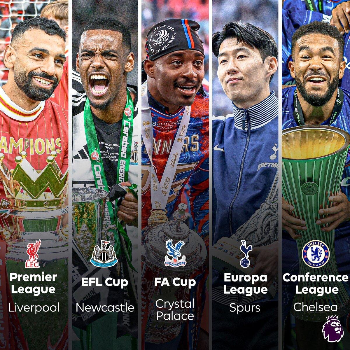 Впервые в истории Премьер-Лиги сразу пять команд завершили сезон с трофеем: 🏆 "Ливерпуль" — Премьер-Лига 🏆 "Ньюкасл" — Кубок Лиги 🏆 "Кристал Пэлас" — Кубок Англии 🏆 "Тоттенхэм" — Лига Европы 🏆 "Челси" — Лига Конференций