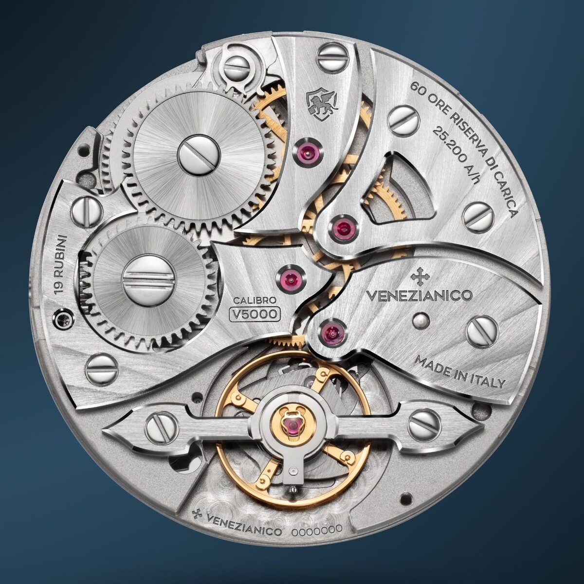 Итальянский бренд презентовал V5000 с ручным заводом, запасом хода 60 часов и точностью +/- 3 сек/день. Среди его особенностей можно выделить баланс с переменной инерцией (колесо из сплава меди и бериллия регулируется с помощью 4 грузиков), разделенную зубчатую передачу для секунд и часов-минут и защиту баланса KIF Elastor от швейцарской KIF Parechoc. Этот механизм внедрен в модель Redentore Utopia, выпущенную лимитированной серией в 100 экземпляров. Ее дизайн вдохновлен водами Венеции, за узор циферблата отвечал мастер Риккардо Ренцетти. Часы получили стальной корпус размером 38 x 8,9 мм и кожаный ремешок в тон циферблата.