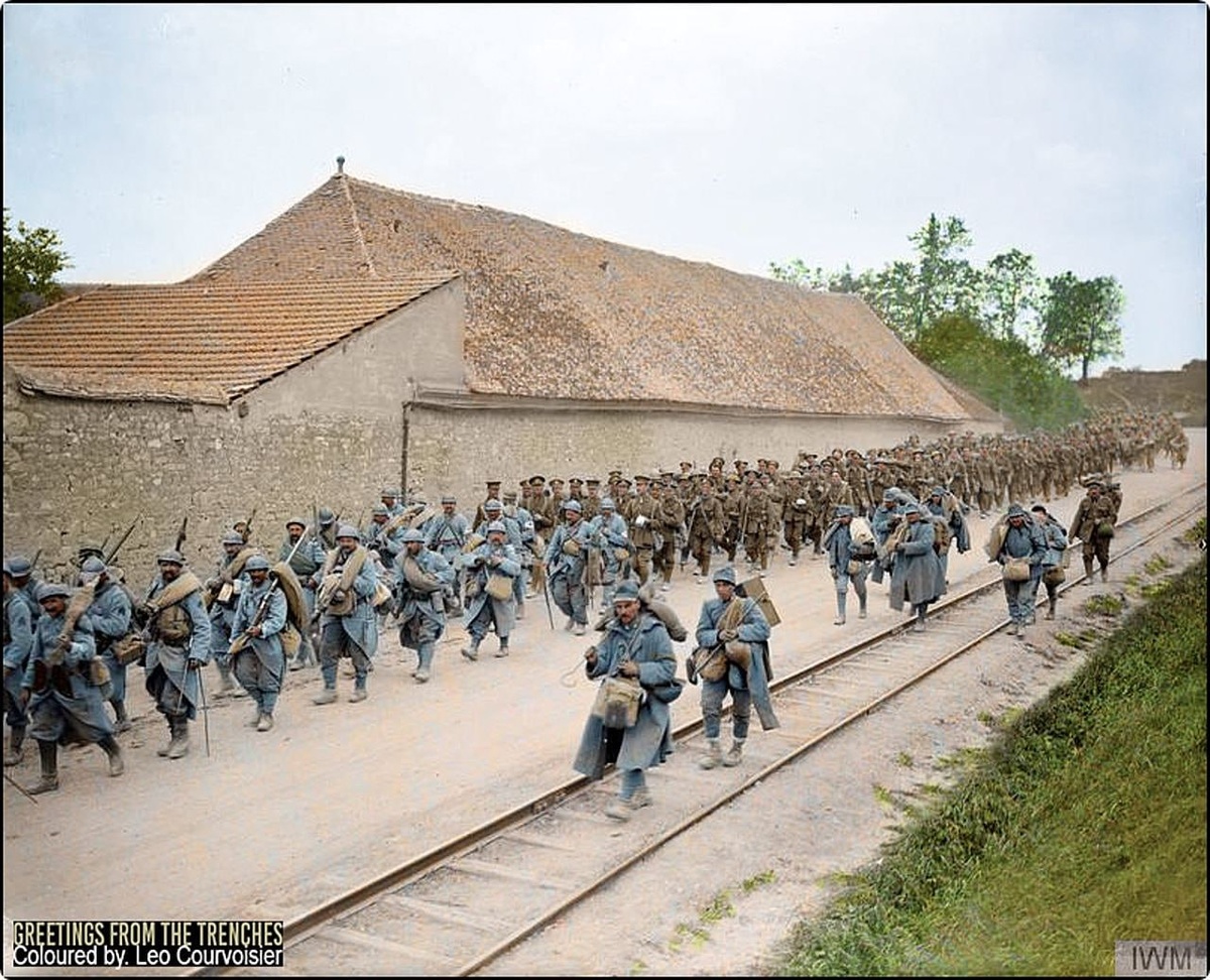 Третье сражение на Эне, во время Весеннего наступления. Французские и британские войска на марше, Эна, Франция, 29 мая 1918 года.