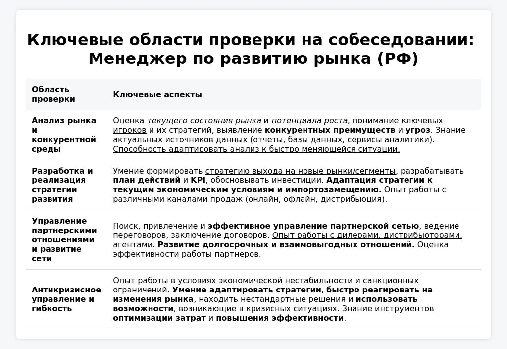 - "Готовы ли вы к командировкам/нестандартному графику?" – Для менеджера по развитию рынка это важный аспект, поэтому отвечайте честно.