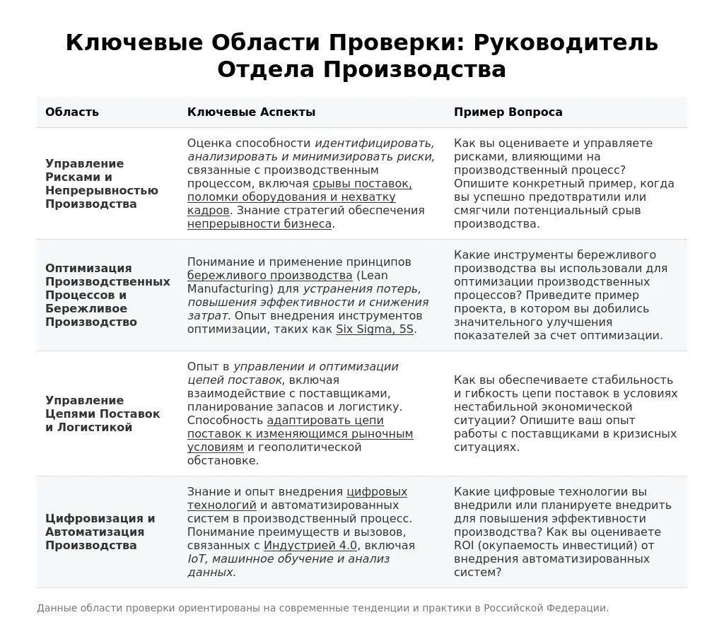 - Знание производственных процессов: Убедитесь, что вы хорошо разбираетесь в технологиях, оборудовании и методах управления производством, используемых в отрасли.