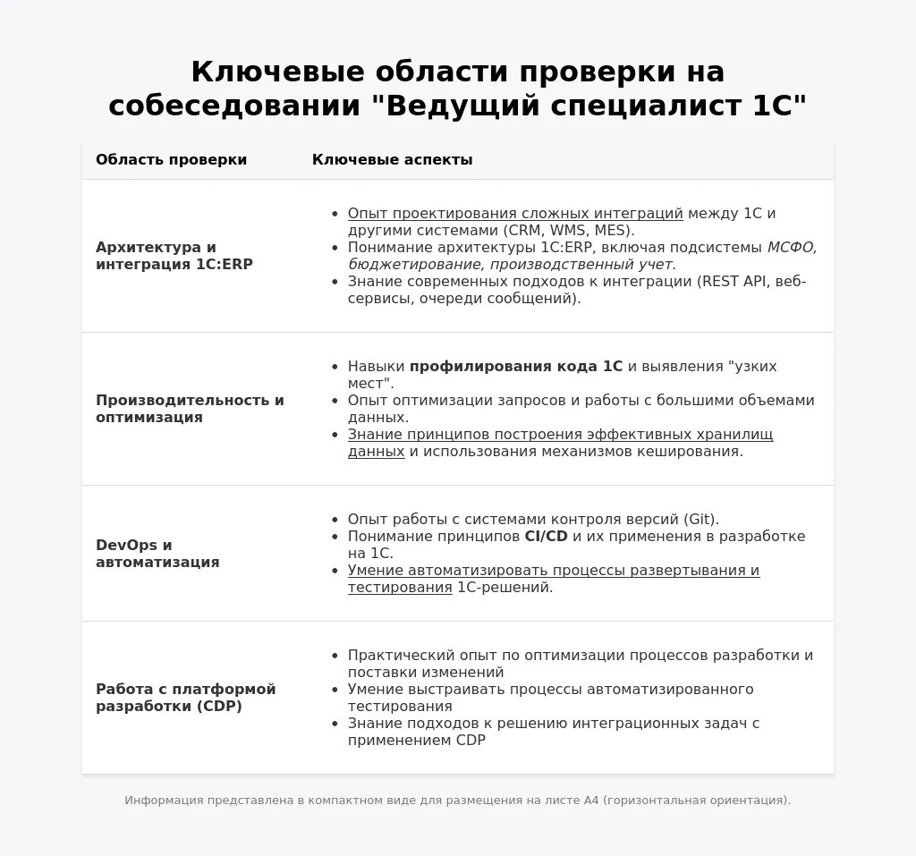 - Технические знания и опыт работы с 1С: Оцениваются знание типовых конфигураций, опыт разработки и внедрения, умение решать сложные технические задачи. Пример: попросят рассказать о проекте, где вы оптимизировали производительность системы 1С, используя нестандартные подходы к индексации данных.