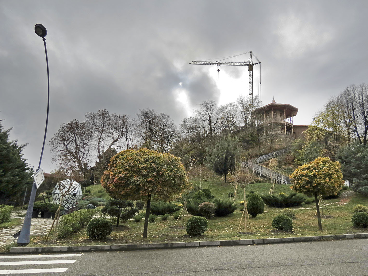 Над центром Телави совсем рядом с крепостью Батонисцихе нависают руины Восточной крепости. Одна из её башен стала беседкой, а за ней стройка отеля "Кахетия" так и стоит неподвижно с советских времён: У подножья - обаятельная Улитка, собранная в 2006 году из всяческих железяк: А за ней притаился Телавский платан, примечательный не только тем, что под его сенью Мимино не смог договориться с гаишником, но и тем, что это чуть ли не самое старое дерево Грузии! В путеводителях его часто называют "тысячелетним", а табличка рядом оценивает его возраст в 900 лет. И сообщает другие параметры - 46 метров в высоту, 3,8 метров в ширину, 12 метров в обхвате: Больше всего, конечно, удивляет форма - огромное дупло по сути превратило его в дерево-грот: А с некоторых ракурсов дерево кажется двуруким чудищем наподобие тролля. В целом, Телавский платан смотрится чуть скромнее гигантских дубов Прибалтики или Карабахского платана (самое старое дерево бывшего Союза), но зато к нему не надо забираться в глуш