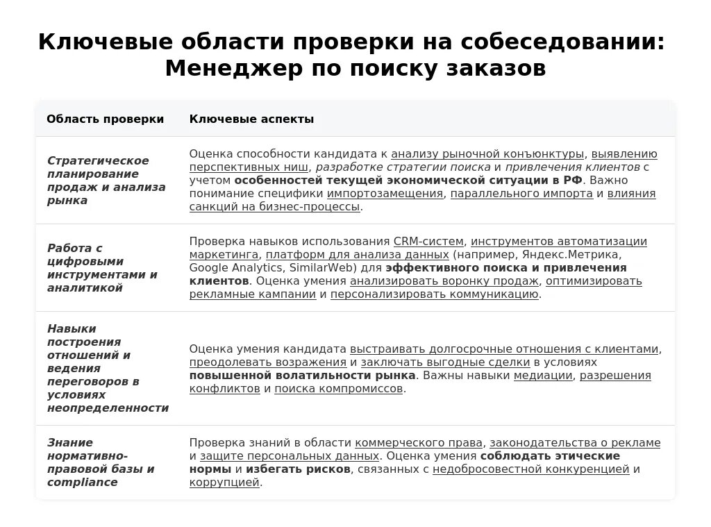 В 2025 году процесс найма менеджеров по поиску заказов становится все более ориентированным на оценку не только профессиональных навыков, но и soft skills, особенно коммуникативных. Компании ищут специалистов, способных эффективно находить и привлекать новых клиентов, выстраивать долгосрочные отношения и приносить прибыль.