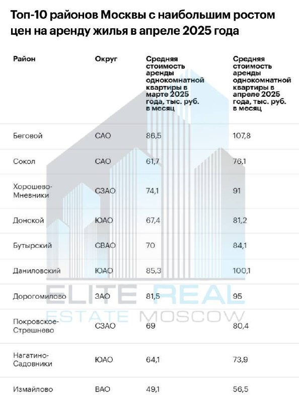 Названы районы Москвы с наибольшим ростом цен на аренду жилья В апреле 2025 года Беговой район стал первым в рейтинге столичных локаций по темпам роста цен на аренду однокомнатных квартир. Средняя стоимость долгосрочной аренды однушки в Беговом районе в апреле выросла по сравнению с мартовским показателем на 24,6%, до 107,8 тыс. руб. в месяц, подсчитали для «РБК Недвижимости» эксперты сервиса «НДВ Супермаркет Недвижимости». Лидерство Бегового района в рейтинге по росту цен на аренду жилья связано с вымыванием наиболее доступных лотов. Также сказалось перетекание спроса с рынка покупки жилья на рынок долгосрочной аренды, уточняют в компании. Второе место с ростом на 23,3% занял район Сокол (до 76,1 тыс. руб.). Третье место у района Хорошево-Мневники, где зафиксирован прирост по сравнению с мартом на 22,7%, до 91 тыс. руб. Четвёртое место с увеличением арендных ставок на 20,6% занял Донской район (до 81,2 тыс. руб.). Замыкает первую пятерку рейтинга Бутырский район с ростом на 20%,
