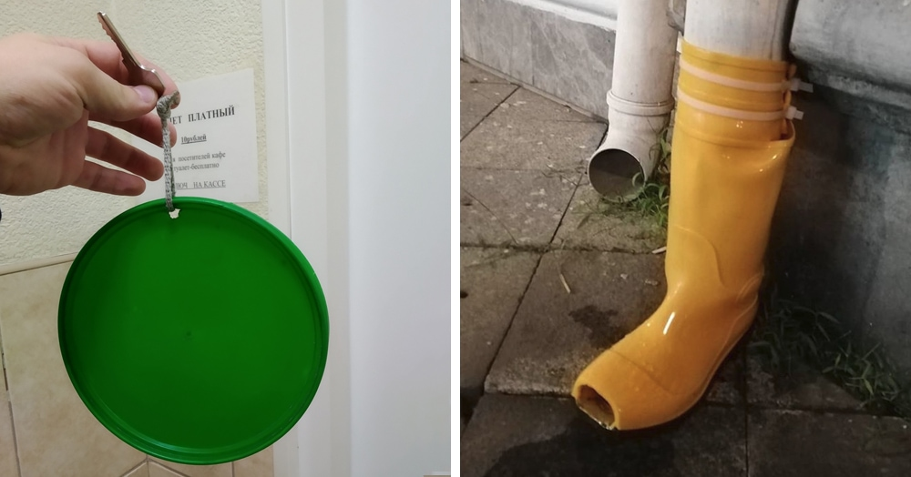 Порой диву даёшься, чего только люди не соорудят из подручных материалов. Казалось бы, нет такой проблемы, которую очумелые мастера на все руки не в состоянии решить. Причём решения эти довольно неоднозначные, среди них есть и гениальные чудеса инженерной мысли, есть весьма странные вещи, а иногда попадаются и такие, что от смеха не сдержаться. Перед вами 20 нестандартных решений для насущных проблем от доморощенных инженеров. Зашли в кафе в Петрозаводске, взяли на кассе ключ от туалета. Плотно обтягивающие сапоги прекрасно подчеркивают естественную кривизну труб. Друг решил сэкономить и поставил сам кондиционер, прислал фото. Благовещенск, наши дни! В одном из подъездов в новостройке. Взяли плиту с Авито за связку бананов. Подключили газовый баллон с редуктором на 0,15 атмосферы. За час работы кирпич прогрелся до 30-35 градусов хватило на 5 часов. В условиях отсутствия нормального отопления вполне хватает для работы) Получается почти полноценная русская печка. Вот что можно сделать из