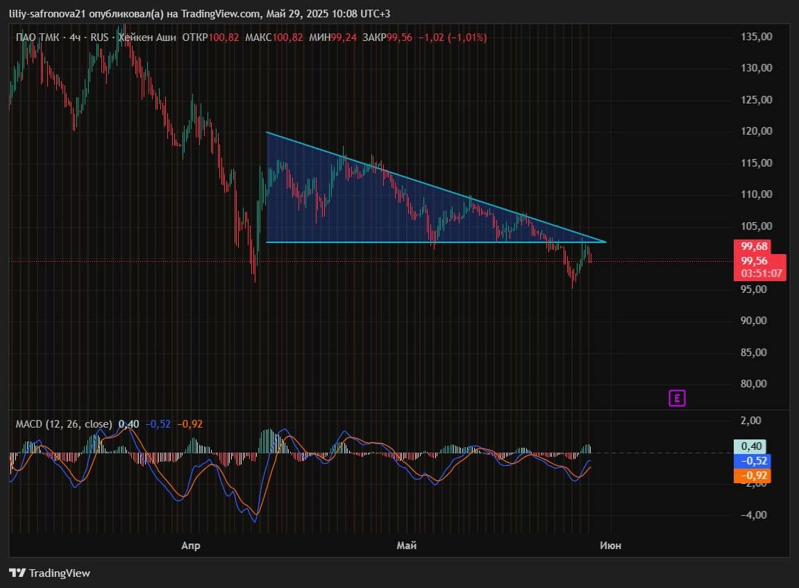 $TRMK 💡 Актив находится в краткосрочном нисходящем тренде. На 4х часовом таймфрейме сформировал треугольник, который отрабатывается вниз. Цена подошла к сильному уровню сопротивления 101,5, уровень сложный, зеркальный! 💡Пробив данный уровень и закрепившись ниже , пойдет отрабатывать цель. ✅Цель отработки фигуры 94,88 📌 Рассмотреть спекулятивно возможно, после отработки фигуры. Моя рекомендация к сделкам относится с осторожностью. Не ИИР #теханализ #трейдер #инвестиции #TRMK