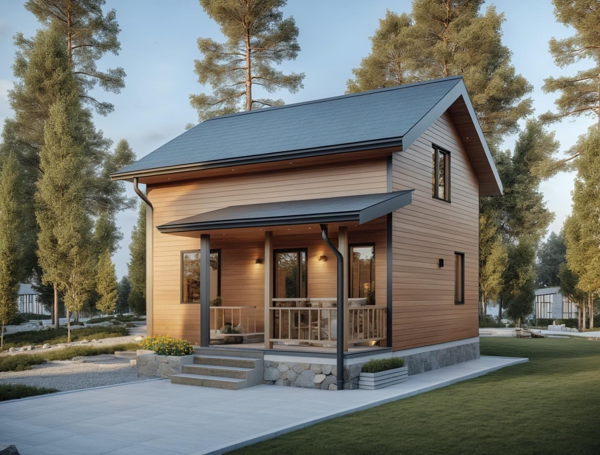 Светлый дом с террасой и мансардой в современном стиле Артикул: 24БЕ14.00-МС-6.0х7.0-91 1. Этажность: Двухэтажный дом с удобной планировкой и компактными габаритами — идеально подойдёт для небольших участков. 2. Площадь: Общая площадь помещений — 68,08 м², включая второй этаж. Общая площадь с террасами и крыльцом — 74,97 м². 3. Планировка 1 этажа: — Крыльцо — 6,89 м² — Прихожая — 10,12 м² — Бойлерная — 2,72 м² — С/у — 4,37 м² — Кухня-гостиная — 18,23 м² 4. Планировка 2 этажа: — Холл — 2,30 м² — Спальня 1 — 15,25 м² — Спальня 2 — 12,11 м² — Гардеробная — 2,97 м² 5. Конструктив: Дом выполнен из деревянного каркаса, габаритные размеры — 6×7 м. Фундамент — ж/б сваи, каркас с шагом стоек 575 мм. 6. Особенности: — Эргономичная планировка для семьи из 2–4 человек — Просторная кухня-гостиная на первом этаже — Две полноценные спальни на втором этаже и гардеробная — Эстетичный фасад в натуральных тонах, двускатная кровля — Подходит для постоянного проживания или загородного отдыха Как получить