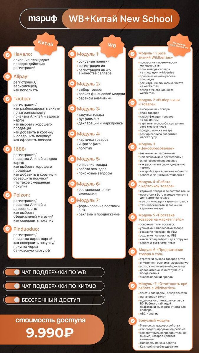 ‼️‼️‼️ 🎉 Грандиозные новости в нашем проекте! 🎉 Теперь в рамках нашего обучения вы можете получить востребованную и перспективную профессию — Менеджер маркетплейса! 🤩 Что вас ждет, читайте в деталях на прикрепленном макете ☝️ Доступно в тарифах: ⦁ Комбо: 13 990₽ ( Включает всю полную информацию всего обучения) ⦁ Китай + WB: 9 900₽ (оптимальный выбор для тех, кого интересует только Китай + выход селлером на WB+ профессия менеджера WB) 💲 Не откладывайте! Доступна комфортная рассрочка! На просторах интернета, такие курсы стоят в десятки раз дороже! Пишите мне @Markel_son