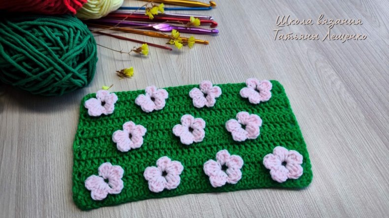 Набираем количество петель кратно 10-ти, я набрала 40 петель. 1 ряд: набираем 3 в/п подъема и в каждую петлю провязываем с/н. 2 ряд: берем дополнительный цвет и прокладываем его вдоль вязания. Провязываем 4 с/н. В следующую петлю вяжем (с/н, 1 в.п., с/н) это основа для цветка. Теперь берем розовый цвет, вводим крючок под последний столбик и вытягиваем петтлю. Далее вяжем 2 в.п. 2 с/н, 2 в.п. и с.с. под столбик. Получился первый лепесток, Здесь же вяжем и 2-й лепесток. Набираем 2 в.п. и следующие 3 лепестка вяжем под противоположный столбик. Когда цветок готов зеленую петлю продеваем через розовую и продолжаем вязание зеленым цветом, розовую нить так же прокладываем вдоль вязания. Для удобства подворачиваем лепестки и провязываем 9 с/н. В 10-ю петлю формируем основу для цветка (с/н, 1 в.п., с/н) Таким образом провязываем до конца ряда. На этом этап