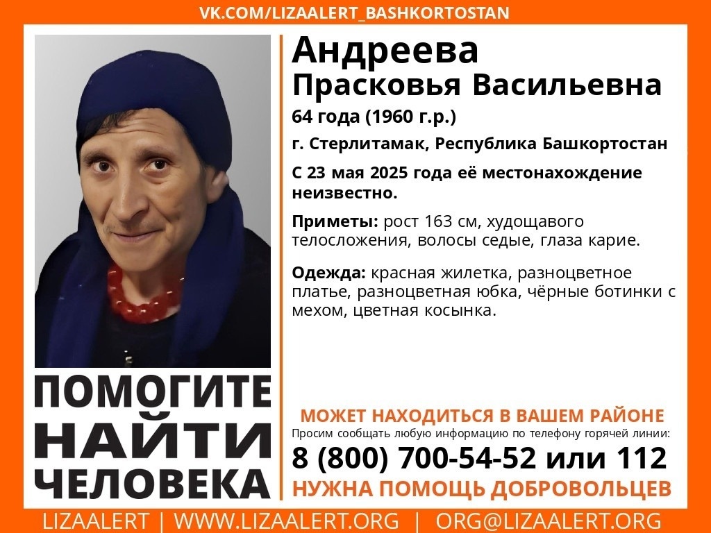 64-летняя жительница Стерлитамака Прасковья Андреева пропала без вести в Башкирии 23 мая. По данным отряда «Лиза Алерт РБ», женщина была одета в красную жилетку, разноцветные платье и юбку, черные меховые ботинки и косынку. Среди других ее примет – рост 163 см, худощавое телосложение, седые волосы, карие глаза. Ранее в республике сидевшие в гостях родители потеряли 3-летнего ребенка.