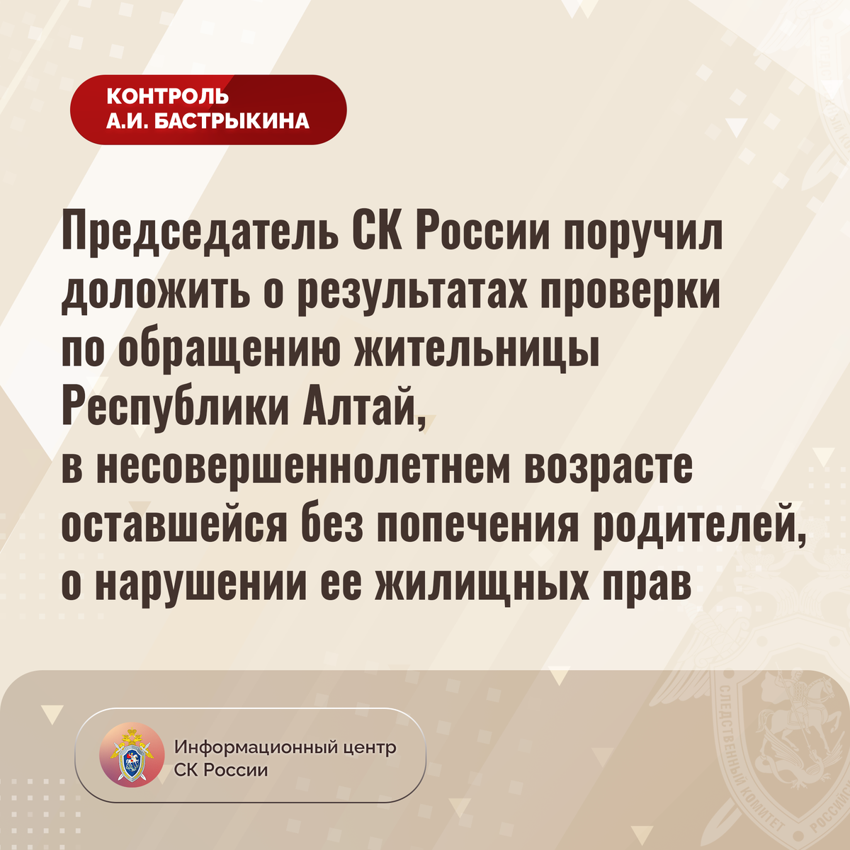 Председатель СК России поручил доложить о результатах проверки по обращению жительницы Республики Алтай, в несовершеннолетнем возрасте оставшейся без попечения родителей, о нарушении ее жилищных прав В Информационный центр СК России поступило обращение жительницы Республики Алтай, в несовершеннолетнем возрасте оставшейся без попечения родителей, по вопросу нарушения ее жилищных прав. С 2016 года девушка состоит в специализированной очереди, однако до настоящего времени меры к реализации ее прав не приняты. Кроме того, заявительнице необоснованно отказано в предоставлении сертификата для приобретения квартиры. Многочисленные обращения результатов не принесли. В СУ СК России по Республике Алтай по поступившему обращению начата процессуальная проверка. Председатель Следственного комитета Российской Федерации Александр Иванович Бастрыкин поручил и.о. руководителя СУ СК России по Республике Алтай Константину Борисовичу Мальцеву представить доклад о ходе и результатах процессуальной проверк