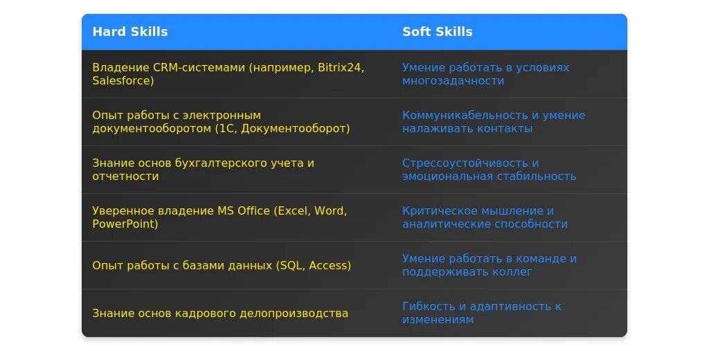 - Укажите ключевые навыки, такие как организация встреч, управление документами, работа с CRM-системами.