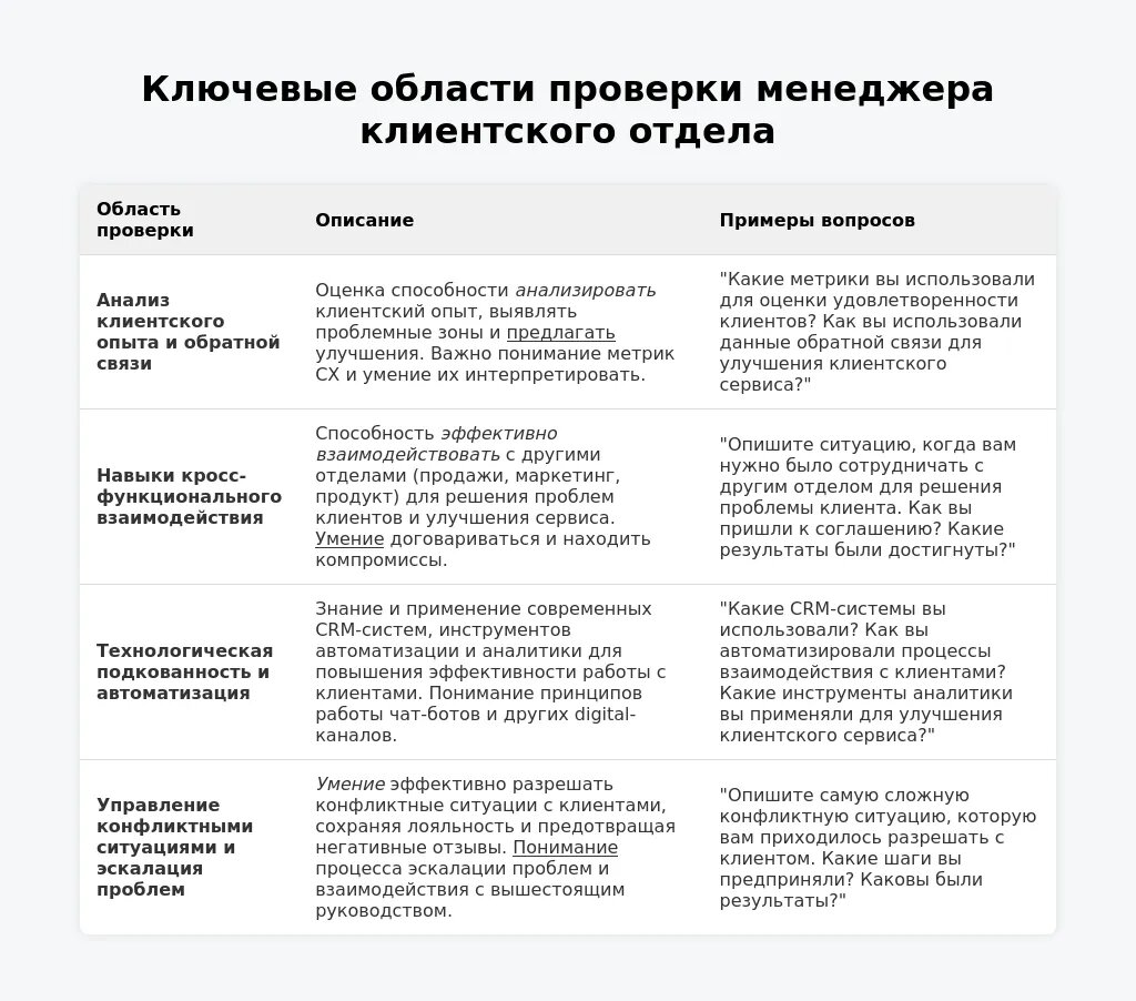 Коммуникативные навыки оцениваются через ролевые игры, анализ кейсов и наблюдение за поведением кандидата в различных ситуациях. Клиентоориентированность проверяется через вопросы о предыдущем опыте работы с клиентами и анализ предложенных решений в проблемных ситуациях.