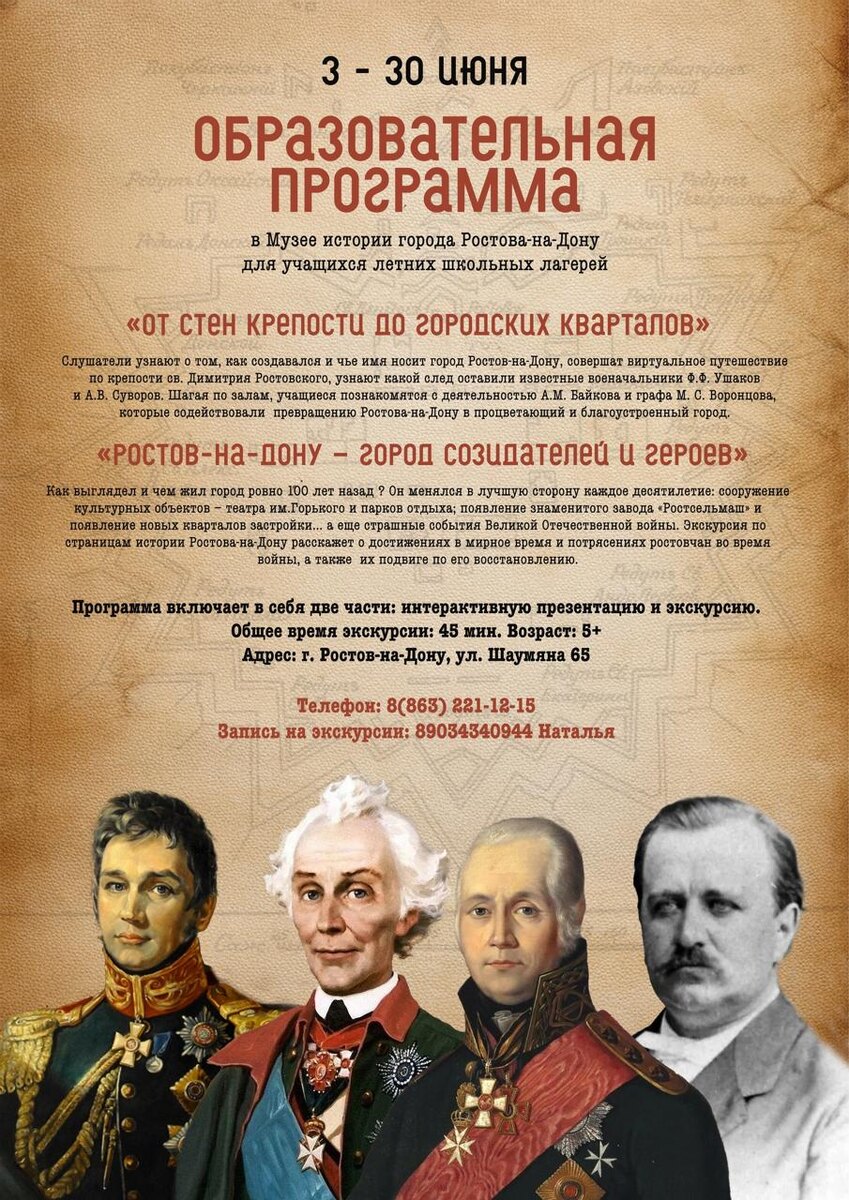 С 3 по 30 июня 2025 г. в Музее истории города Ростова-на-Дону будет работать образовательная программа для учащихся летних школьных лагерей.