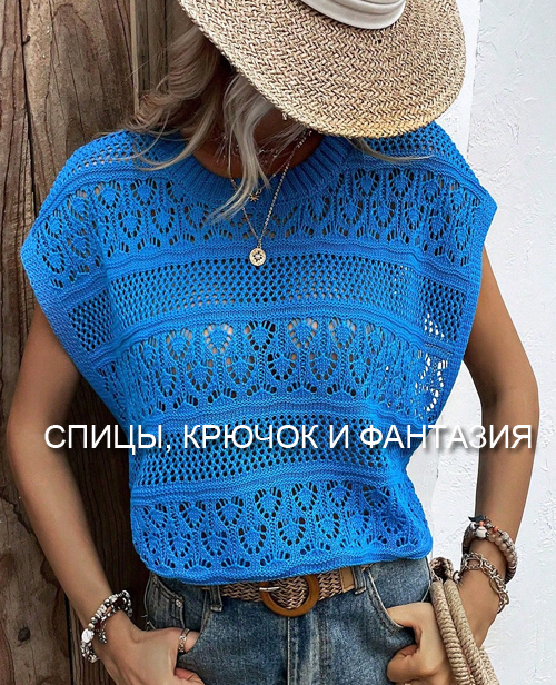 ✔ Выделяться из толпы с эффектными, но простыми в исполнении моделями Мы собрали 10 потрясающих идей — от соблазнительных топов до лёгких жакетов и джемперов Моя страничка ВКонтакте: https://vk.com/irina_knit_ru Мой канал на Рутубе: https://rutube.ru/channel/23731313/ Мой Телеграм: https://t.me/+l8qqiDZ_4cBlMDE6 №1 Васильковый ажурный топ станет ярким акцентом вашего летнего гардероба. Свободный прямой силуэт, спущенное плечо, круглая горловина и слегка укороченная длина делают его удобным и стильным. Топ связан из двух прямоугольников: один с круглым вырезом спереди, другой — для спинки. Горловина оформлена резинкой 2х2, а проймы рукавов — резинкой 1х1 с снятыми петлями. №2 Белый ажурный кардиган с расклешенными рук