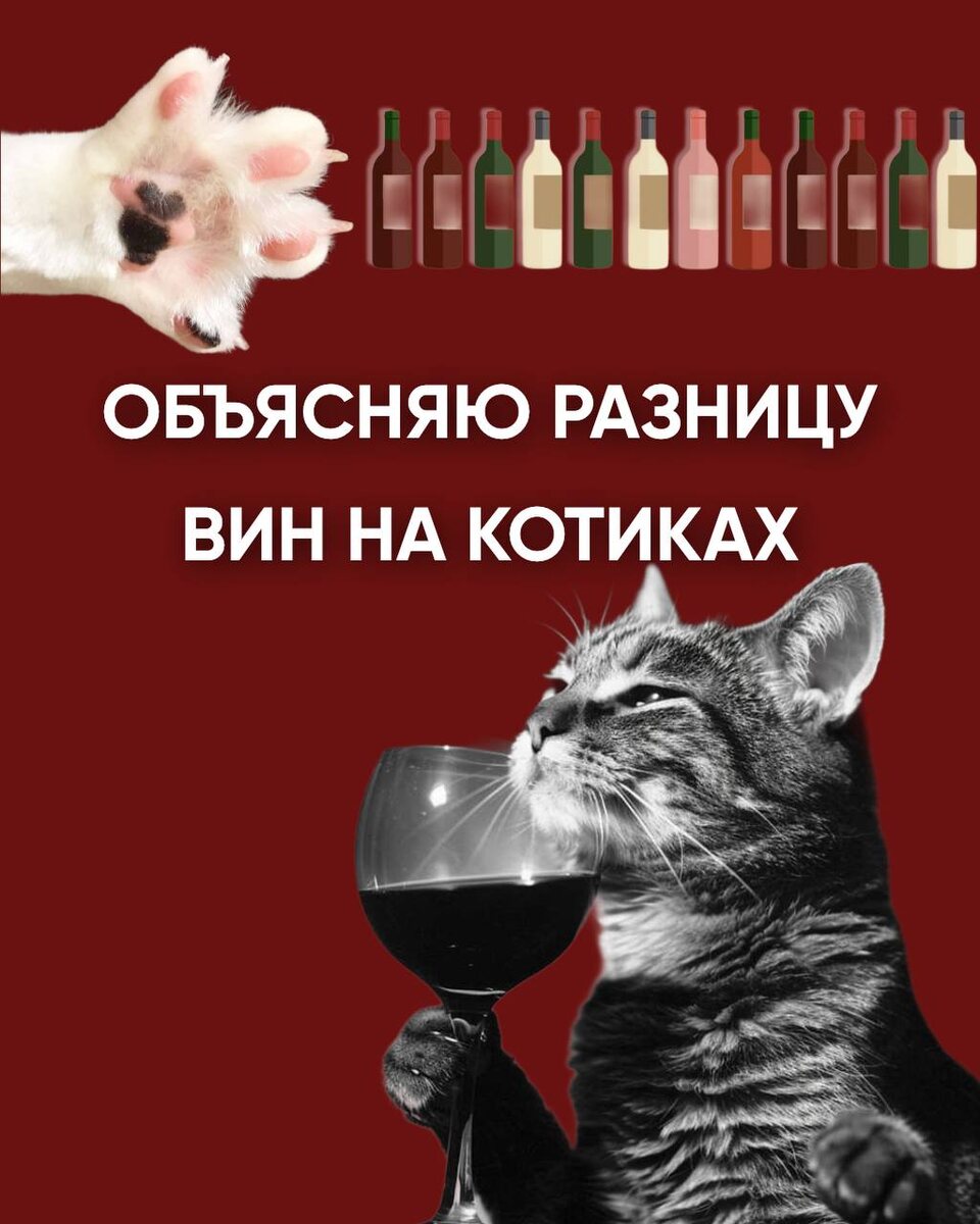 Чем различаются вина? Объясняю разницу сортов с помощью котиков 😸 Вина, как и котики, бывают разными: одни — лёгкие и игривые, другие — глубокие и характерные. Давайте разберёмся вместе! Листайте картинки и пишите свои ассоциации вин с котиками, которые не поместились в этот пост.