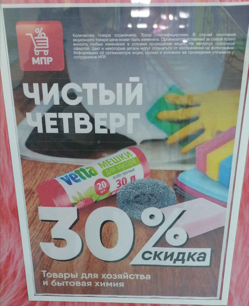 Сегодня снова зашла в свой любимый магазин МПР, а там опять акция, только в этот раз была 30% скидка на товары для уборки дома.