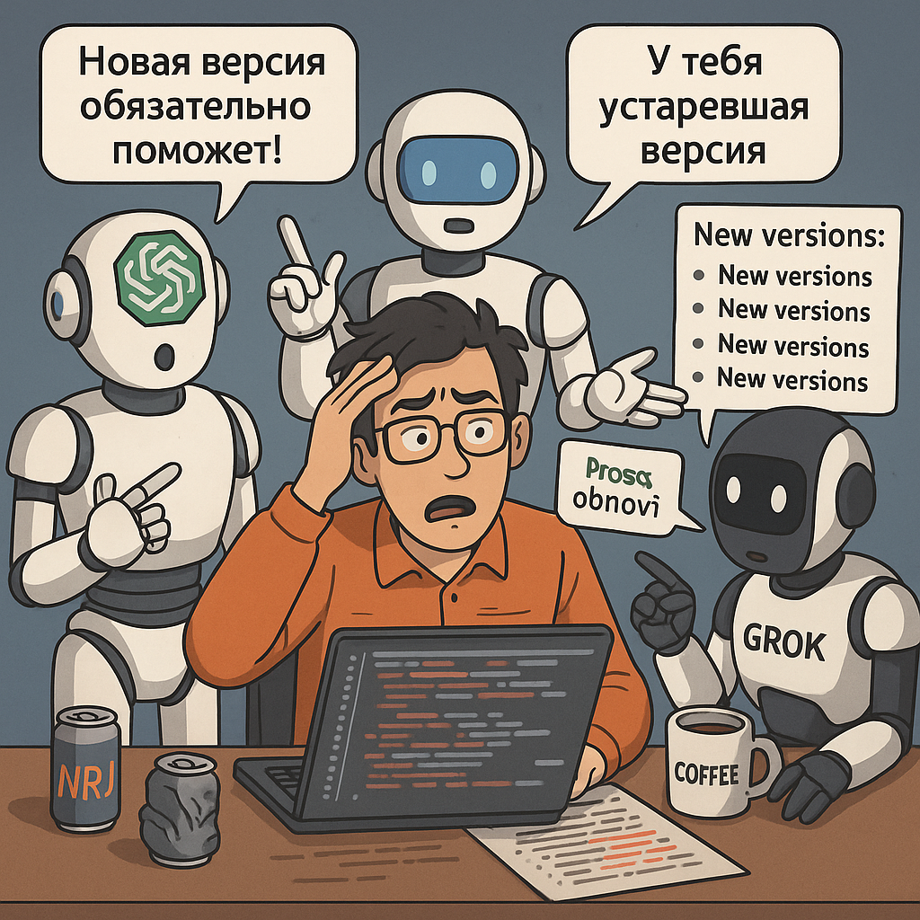 Недавно писал о том, как ИИ помогает мне в работе: программирование, верстка, автоматизация — всё это стало гораздо быстрее и проще с ChatGPT, Gemini, Grok и прочими “электронными помощниками” ⚡️💻 Но сегодня хочу рассказать, как полезный ИИ иногда превращается в весьма убедительного фантазёра 🦄. Понадобилось мне подключить одну библиотеку к своему проекту. Спрашиваю у ChatGPT: «Как сделать вот это?» Он мне быстро выдает инструкцию — вот так и вот так, делай, друг! 🤓 Читаю... и понимаю, что половины методов в библиотеке просто нет 🫥. Спрашиваю: — Ты уверен, что эти методы существуют? ИИ уверенно отвечает: — Конечно, просто у тебя старая версия, обнови! 🔄 Проверяю — нет, никакой новой версии не существует, и обновить не на что. Проверил разными способами — глухо 🕵️♂️. На следующий день решил попробовать спросить у Gemini (ну а вдруг!). Gemini подумал-подумал — и выдает ровно то же самое: — У тебя старая версия, надо обновить! 🤷♂️ Тут я начал сомневаться в себе: может, что-то не