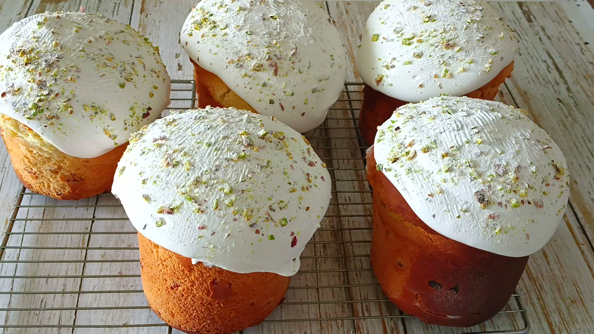 Для теста: Для глазури: Общий выход составил 5 куличей по 550 г. Пищевая ценность продукта на 100 грамм: Для приготовления опары все продукты от общего рецепта. В тёплое молоко 200 г., добавляю 50 г. сахара и дрожжи. Перемешиваю. Накрываю и убираю в тёплое место. В яйца добавляю сахар и соль. Вымешиваю миксером. В творог добавляю ванилин, растопленное сливочное масло. Пробиваю блендером. Творожная основа после пробивания стала гладкая. Во взбитые яйца добавляю тёплое молоко, творожную основу и опару перемешиваю миксером. Добавляю всю муку. Тщательно вымешиваю миксером, насадкой для теста. Накрываю ёмкость с тестом и убираю в тёплое место на 40 минут. В промытый и обсушенный изюм всыпаю чайную ложку муки. Перемешиваю. Желатин заливаю водой. Перемешиваю. Оставляю набухать. После расстойки, тесто хорошо поднялось. Всыпаю изюм. Вымешиваю миксером. Порционно раскладываю тесто по пасхальным формам. Накрываю и убираю формы с тестом на расстойку на 30 минут. После расстойки тесто поднялось пы