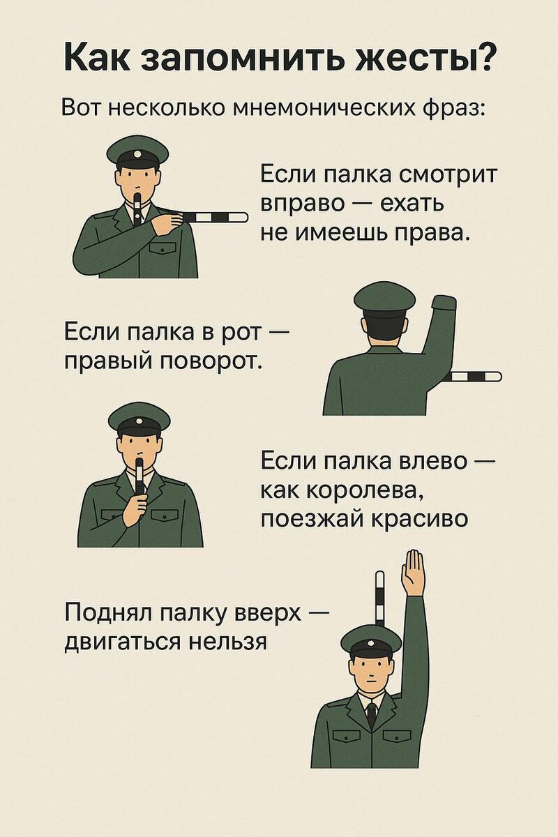 🚦 Как понять регулировщика на дороге: правила и жесты Когда светофор не работает или пробка не дает проехать, на помощь приходит регулировщик. Чтобы избежать проблем, важно точно понимать его жесты. 👮♂️ Кто такой регулировщик? Это сотрудник ГИБДД или представители других служб, таких как военная автоинспекция или дорожные службы. Его сигналы обязательно нужно соблюдать, даже если они противоречат светофору. 🔴 Запрещающие жесты: руки прижаты к телу или разведены в стороны — стойте! Поднятая рука вверх — тоже запрещающий сигнал. 🟡 Предупреждающие жесты: одна рука поднята вверх, другая прижата — готовьтесь к следующему сигналу. 🟢 Разрешающие жесты: если регулировщик вытянул руку и направил жезл в вашу сторону — можно поворачивать. Когда жезл направлен влево, а регулировщик повернулся к вам — двигайтесь! 📣 Сигналы свистком: если слышите свисток, откройте окно и готовьтесь к сигналу. ❗ Штрафы: нарушение сигналов регулировщика может обернуться штрафом до 5000 рублей или даже ли