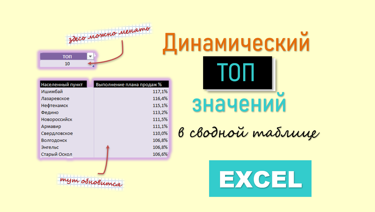 Привет, коллега, на связи Ленивый аналитик) Поняла, что мне даже не нужно придумывать темы для своего контента - их подкидывает моя работа с завидной регулярностью. Ну а я человек простой, вижу что-то интересное - делюсь)) Только я поделилась в своем Телеграмм-канале, как сделать в сводной таблице ТОП-n значений, как мне прилетел запрос сделать отчет, который бы выводил определенное количество ТОП-значений списка - и это значение должно быть динамическим. Ну то есть, сегодня заказчик хочет видеть ТОП-5, а завтра ТОП-10. Можно так? Можно, причем достаточно просто, если обратиться к Power Query. >>> если ты еще не знаком с Power Query, то посмотри на моем канале подборку Power Query <<< (для тех, кто подписан на меня и в телеге поясню, что покажу на тех же цифрах, т.к. на реальных данных, конечно же, нельзя) Список населенных пунктов и процент выполнения плана продаж. Всего в списке 215 населенных пунктов. Для этого щелкнем в любой ячейке внутри диапазона данных, перейдем на вкладк