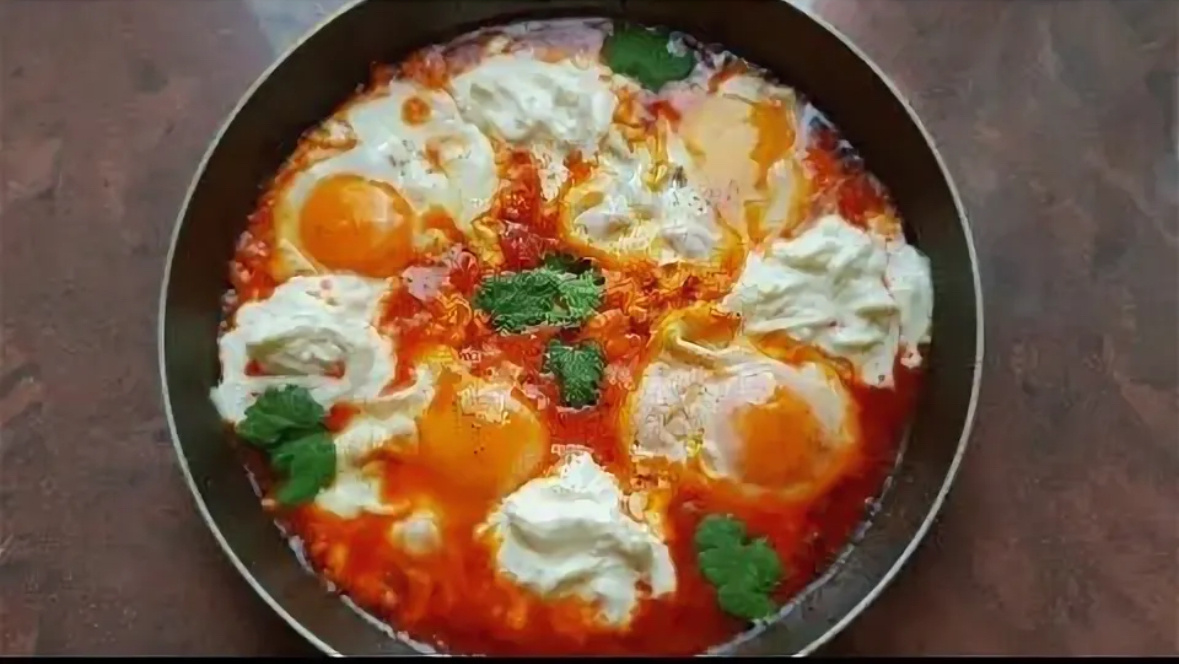 - Аккуратно вбить куриные яйца в овощную смесь, стараясь не повредить желток. Дополнительно посолить и поперчить яйца. Готовить шакшуку ещё 2 минуты, до желаемой готовности яиц.