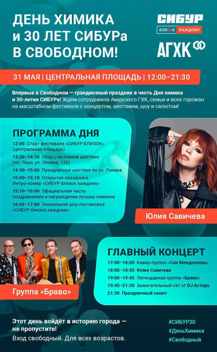 Грандиозное празднования Дня химика и 30-летия СИБУРа в Свободном! Уже в эту субботу, 31 мая, заготовлена очень насыщенная программа. • В 12 часов стартуем с городского фестиваля, который пройдет на центральной площади. Здесь будут работать иммерсивная зона с VR-очками, тесла-шоу, экологические мастер-классы, аквагрим, химическое шоу, спортивные игры, а еще увлекательный квест, за прохождение которого можно получить подарки. • Еще один важный пункт этого дня — праздничное шествие по улице Ленина. Не пропустите! • И конечно, всех ждет большой концерт на центральной площади, где выступят со своими лучшими хитами Юлия Савичева и группа «Браво». Специально к их приезду мы собрали для вас плейлист, еще есть время повторить любимые песни, чтобы уверенно подпевать. • А ярким завершением дня станет салют! Все подробности праздника, а также самые яркие моменты этого дня ищите в специальном ТГ-канале и социальных сетях Амурского ГХК.