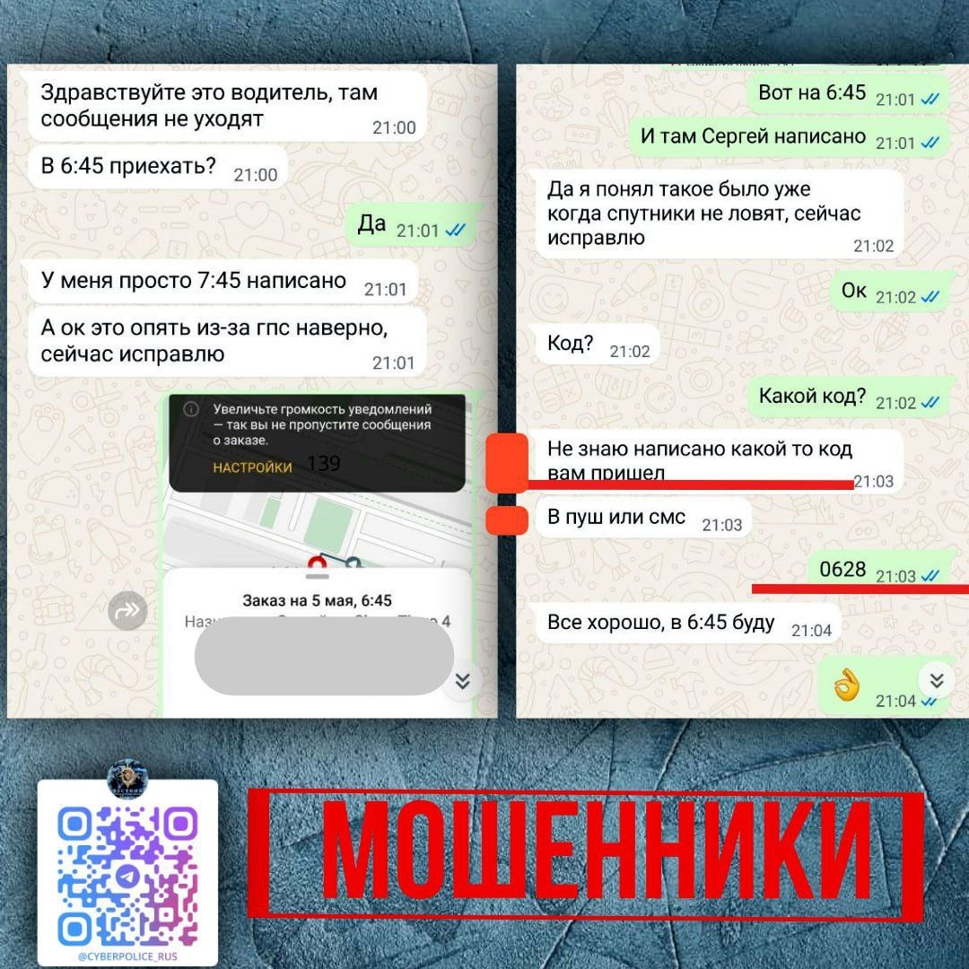 ❗️Как мошенники уводят деньги с карт россиян через сервисы такси: схема редкая, но опасная В России появились новые случаи мошенничества с аккаунтами водителей в сервисах такси. Злоумышленники под видом водителя связываются с клиентом и просят сообщить код из SMS для «подтверждения заявки». После получения кода мошенники получают доступ к аккаунту, оформляют фейковые поездки и выводят средства с привязанной карты жертвы. Такие случаи отмечались в начале года в Алтайском крае и в мае в Приморье. Не сообщайте никому полученные в СМС- и пуш-сообщениях коды - даже если сообщение кажется официальным. Иллюстрация: «Вестник Киберполиции России».