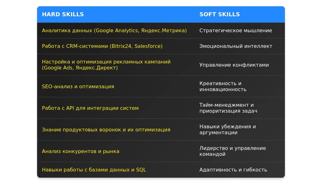 Навыки для акцента: Базовые знания в области маркетинга, аналитики и управления проектами.